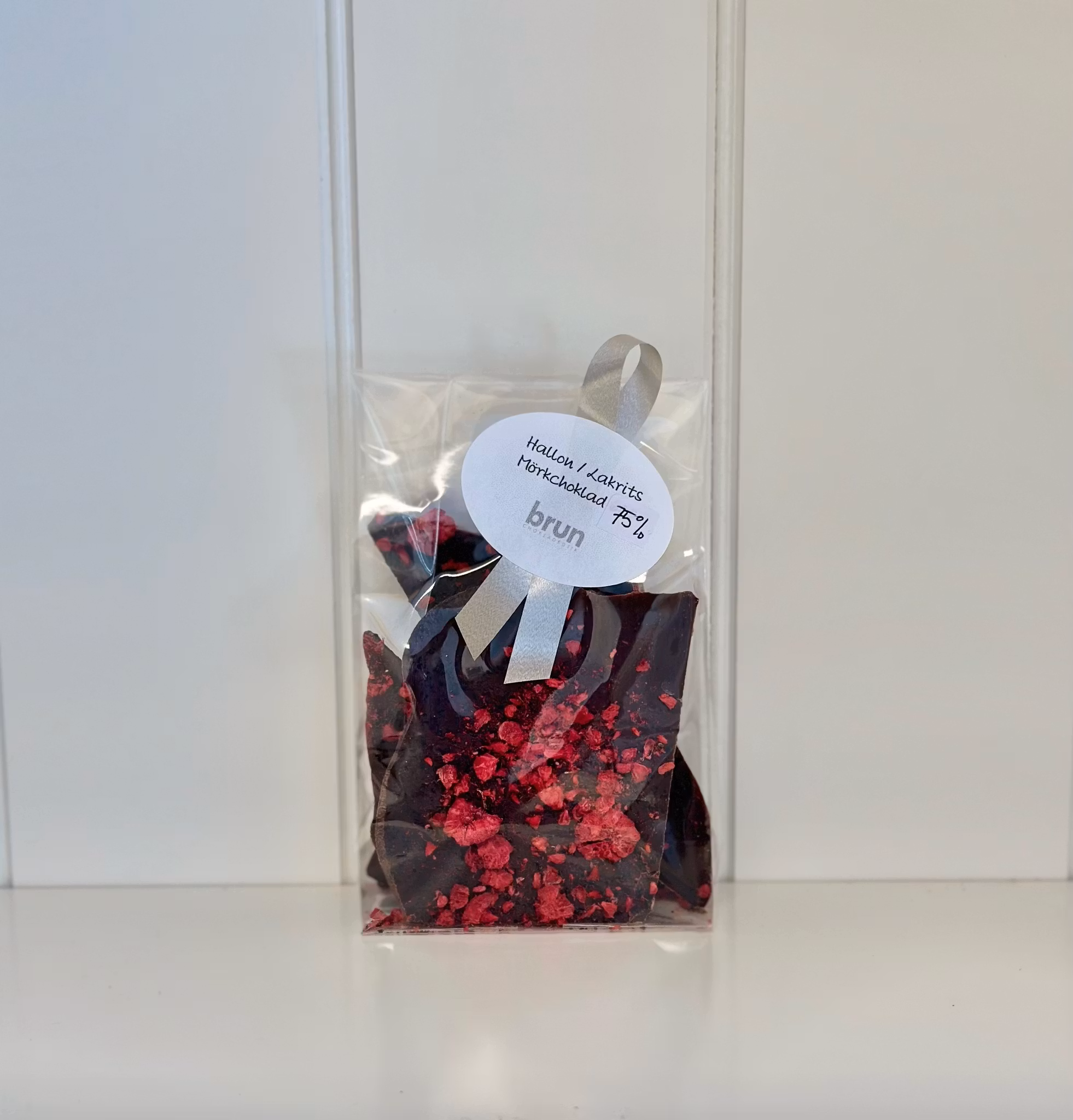 Ingredienser: Mörk choklad (75%) (Kakaomassa, socker, kakaosmör, SOJALECITIN), frystorkad hallon, lakritsgranulat (lakritsrot).