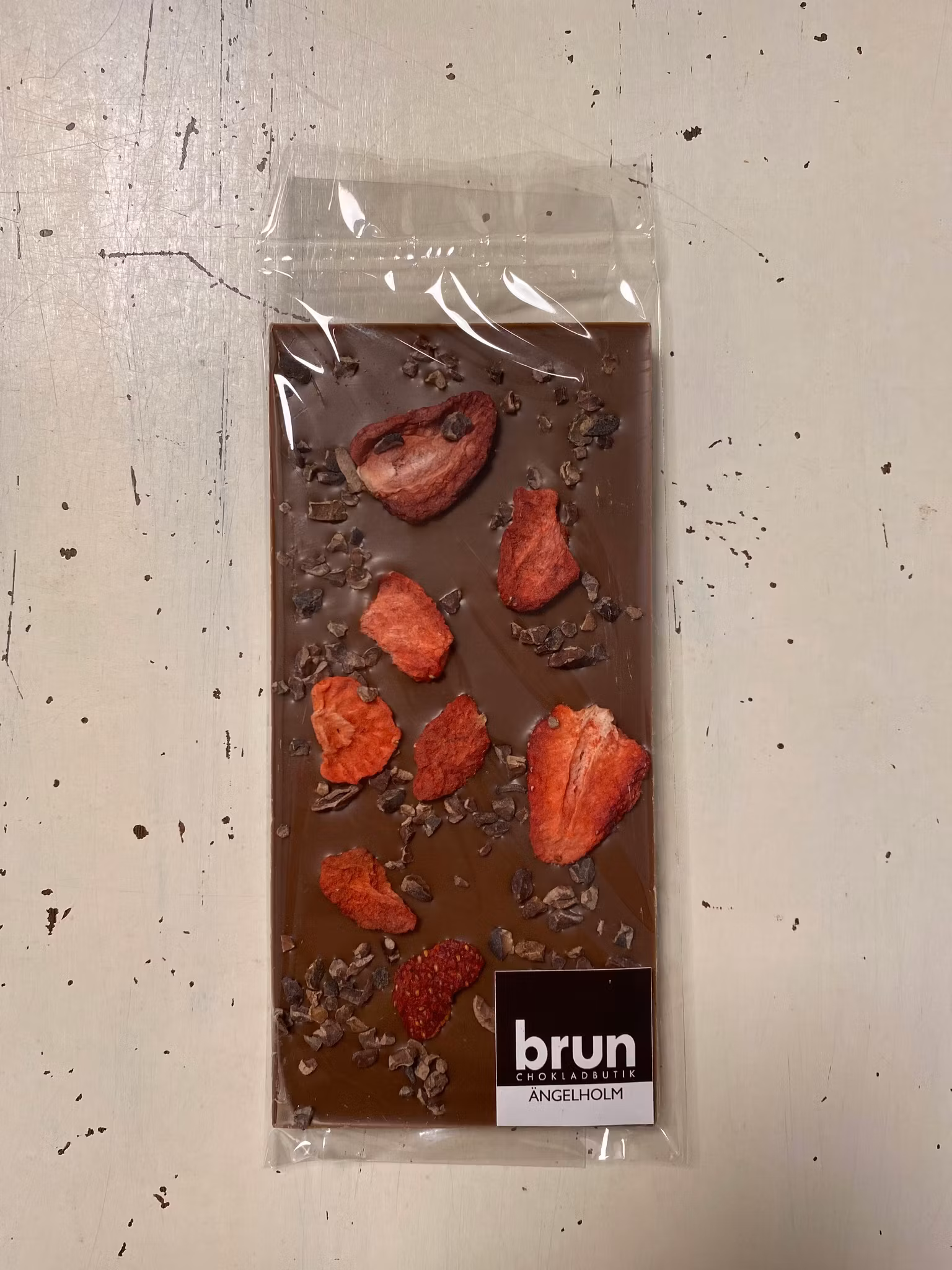 Ingredienser: Socker, kakaosmör, kakaomassa, delvis skummat MJÖLKPULVER, MJÖLKPULVER, emulgeringsmedel (SOJALECITIN), vanilj, jordgubbar, kakaonibs.