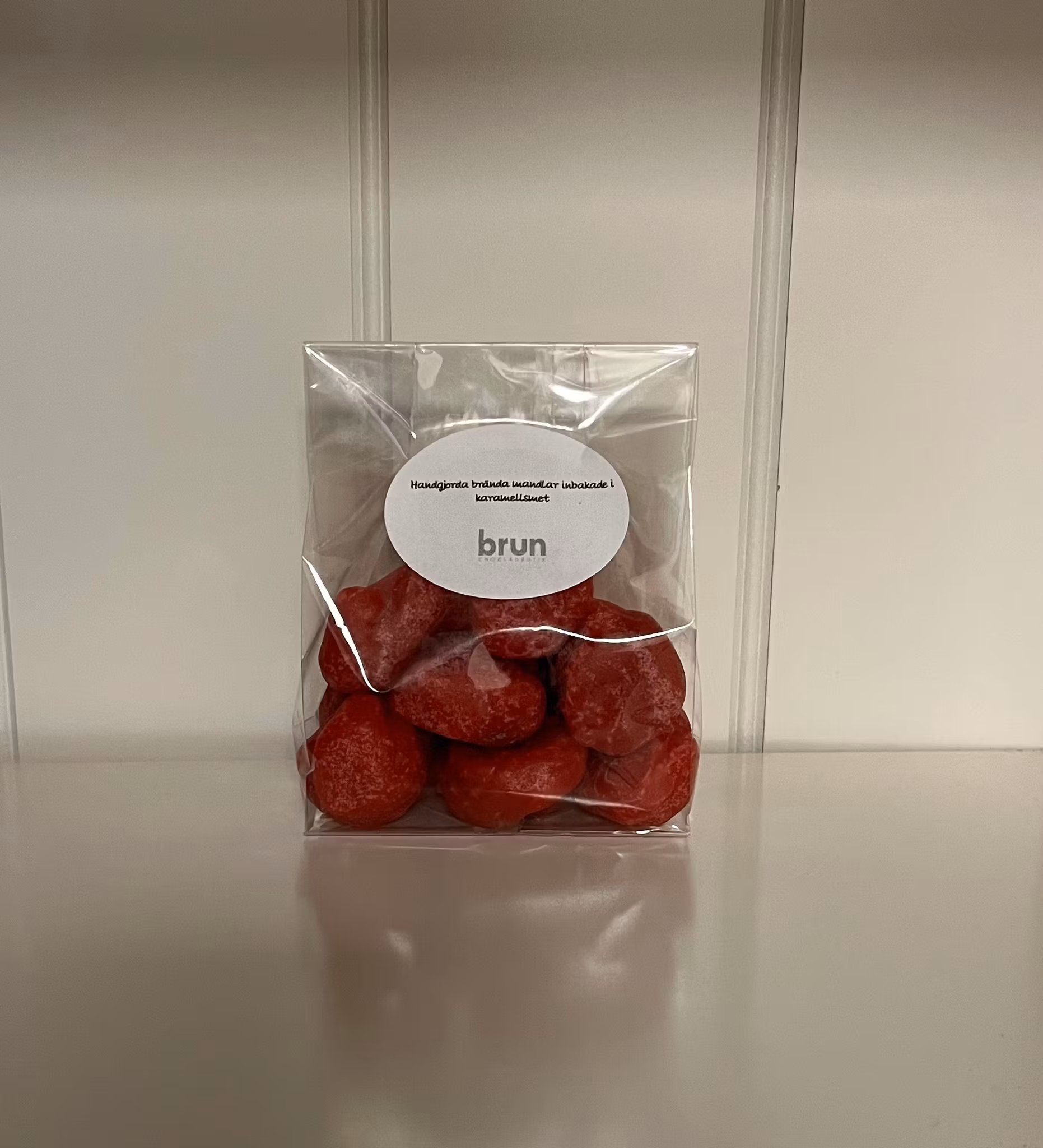 Ingredienser: Socker, glukossirap, MANDEL, MARGARIN (palmolja SG*, rapsolja, vatten kokosfett, salt, emulgeringsmedel (E471), arom, antioxidantionsmedel (E330)), färgämne (E120, E160e).