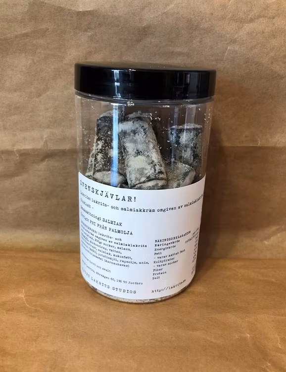 Ingredienser: Socker, melass, VETEMJÖL, glukossirap, vatten, lakritsextrakt, salmiak, kokosfett, sorbitol (E420), potatismjöl, rapsolja, anis, ytbehandlingsmedel (karnaubavax).